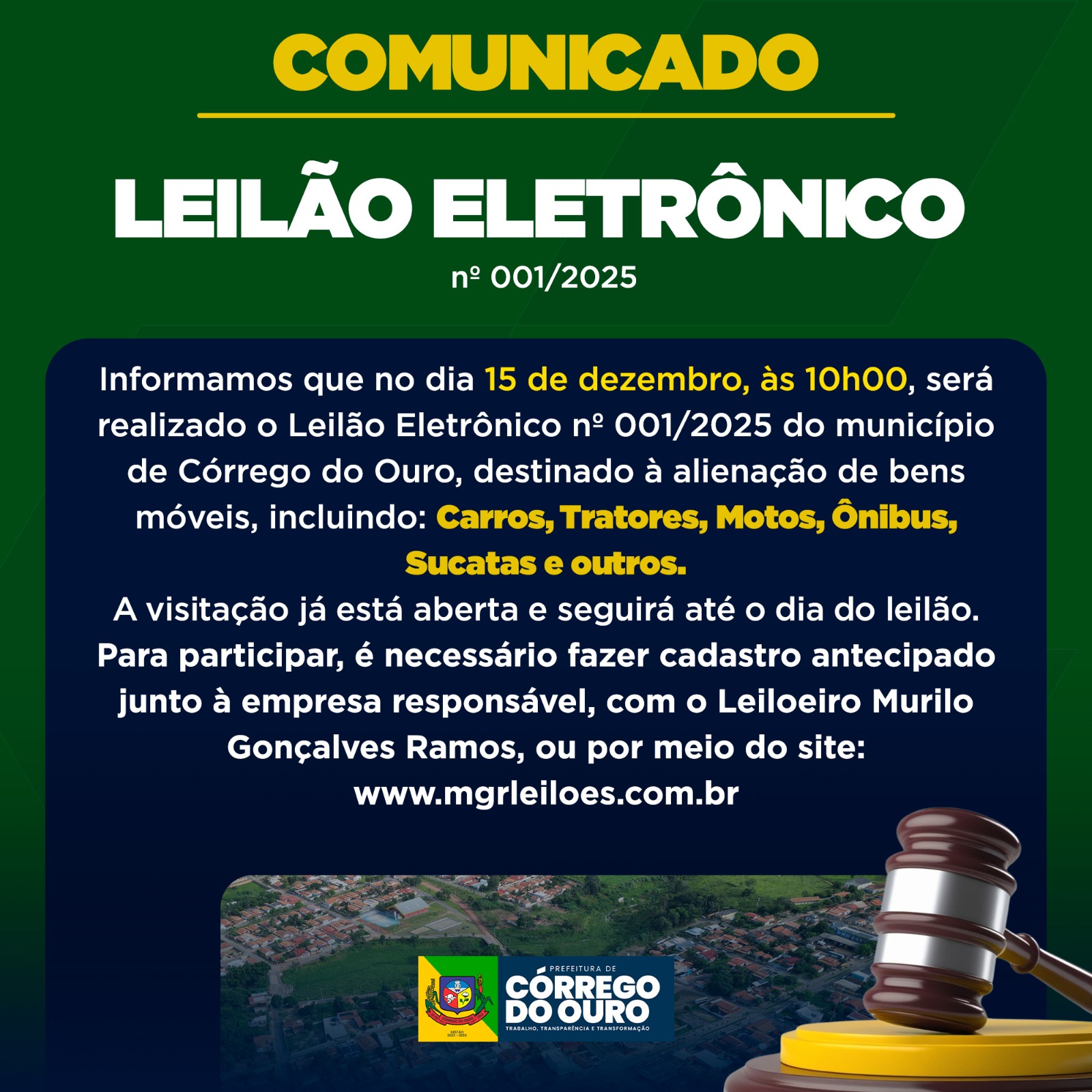 A Prefeitura de Córrego do Ouro informa que no dia 15 de dezembro de 2025, às 10h, será realizado o Leilão Eletrônico nº 001/2025, destinado…